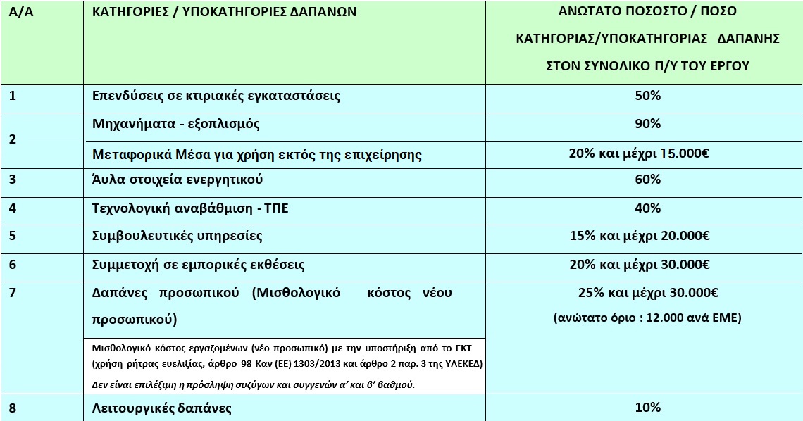 - Δαπάνες στην κατηγορία αυτή είναι επιλέξιμες κατά τη διάρκεια υλοποίησης της πράξης Οι δαπάνες της κατηγορίας αυτής περιλαμβάνονται στο συνολικό επιχορηγούμενο προϋπολογισμό του επενδυτικού σχεδίου και μέχρι του επιλέξιμου ορίου.